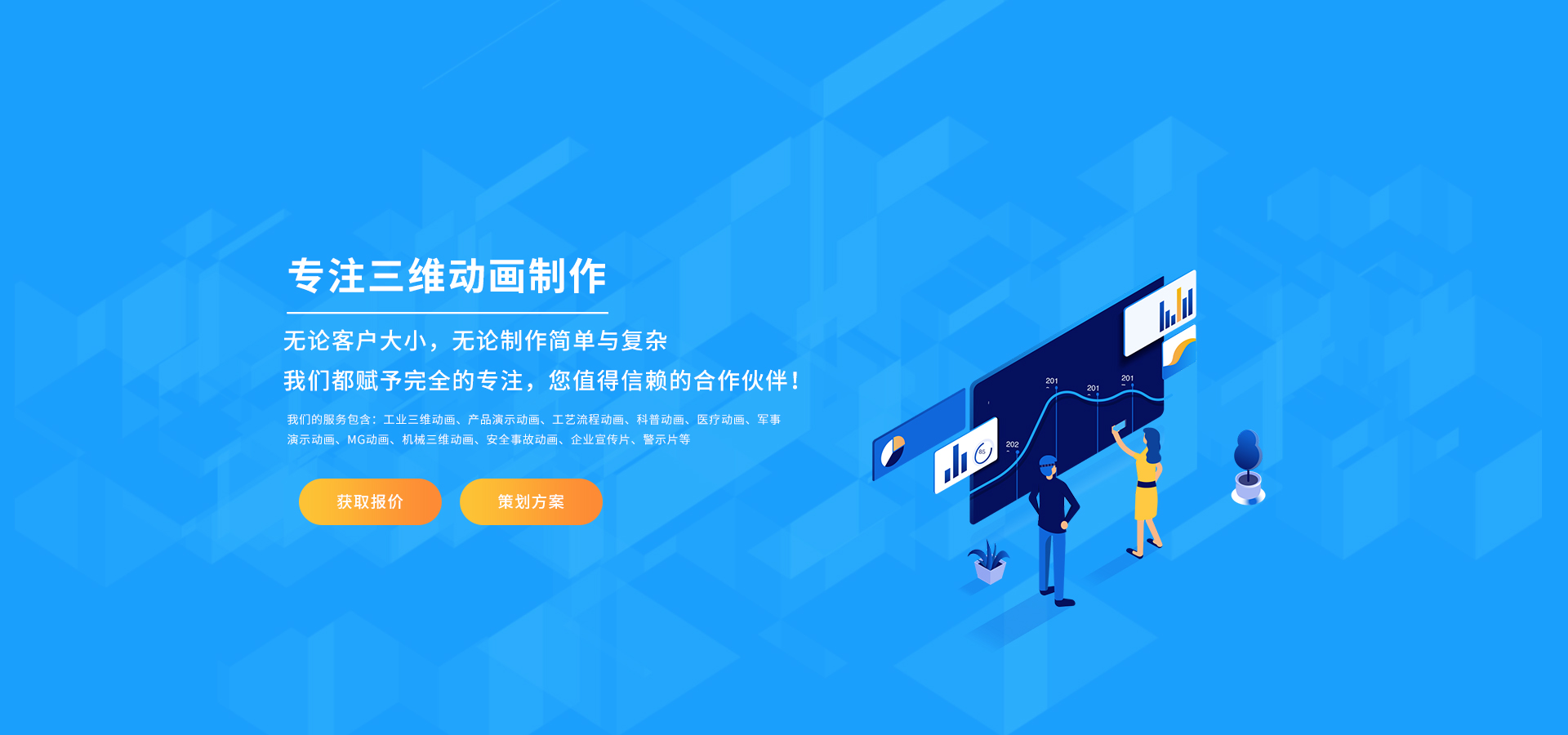 秉承服務至上的原則,為上百家企業打造出優秀的企業宣傳片和三維動畫制作。無論客戶大小,無論制作簡單與復雜,我們都賦予完全的專注,您值得信賴的合作伙伴!